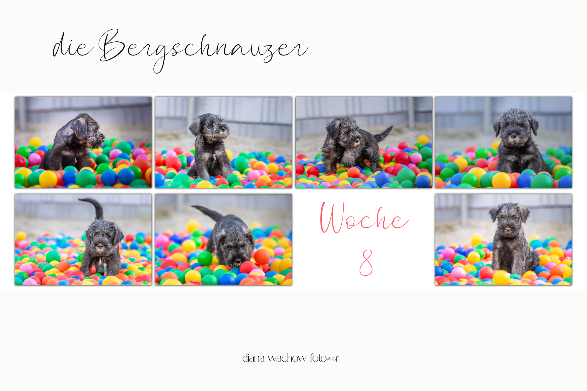 Ab der ersten Woche komme ich jede Woche zu Besuch. Bei jedem Besuch werden mit den Welpen zwei unterschiedliche Sets aufgenommen. Ein Set, welches als Größenentwicklung jede Woche möglichst gleich ist .....